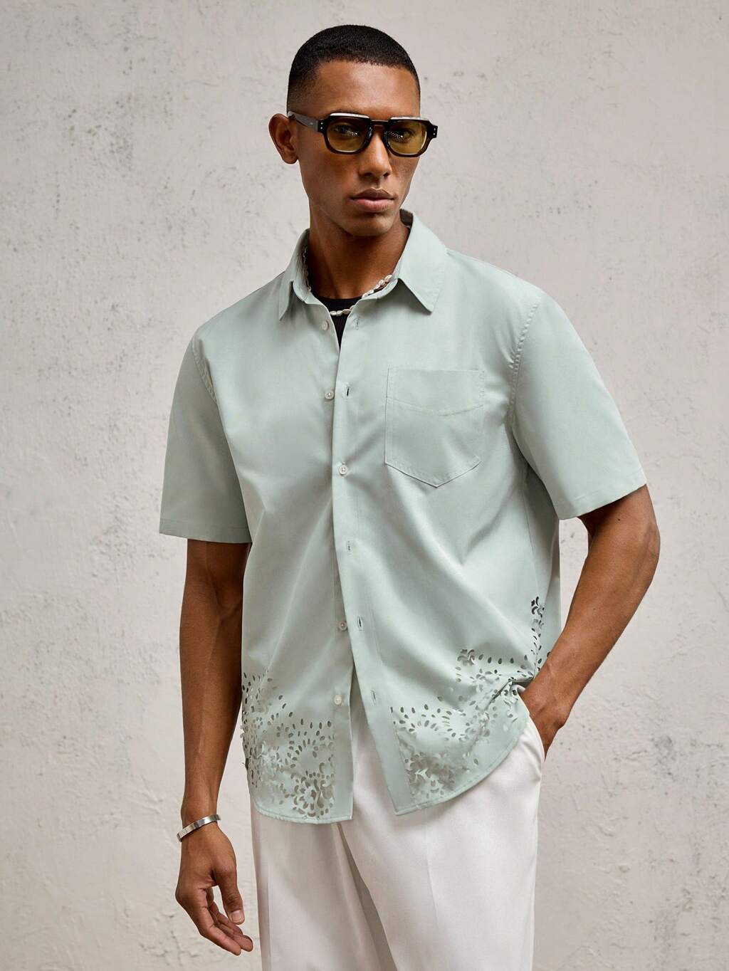 Men's Slim-Fit Turn-Down Collar Short Sleeve Casual Woven Shirt, Suitable For Daily Wear