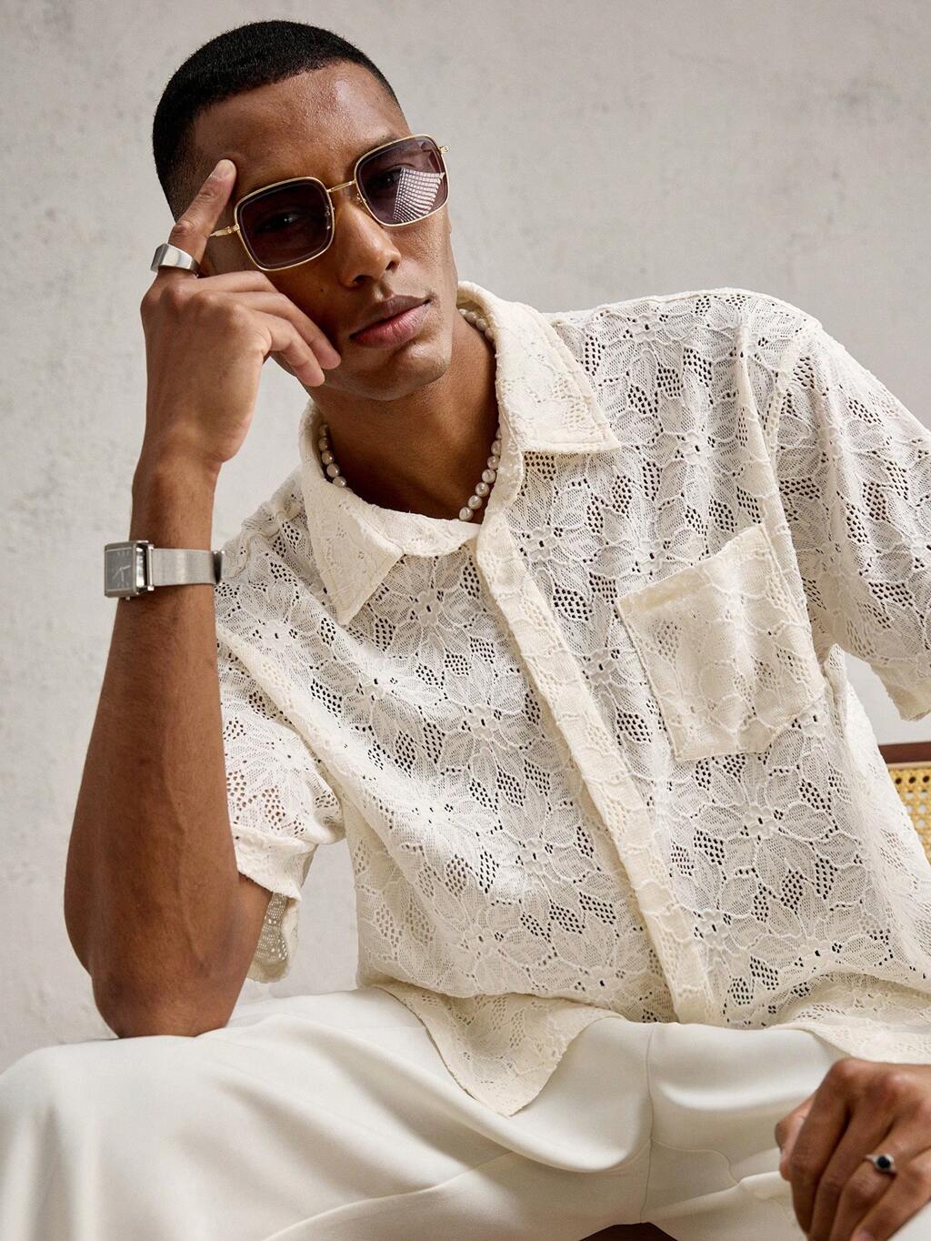 Men Crochet Knit Floral Print Slim Fit Short Sleeve Casual T-Shirt, Suitable For Summer, Vacation, Daily Wear, Party, Couple Matching, Men Gift