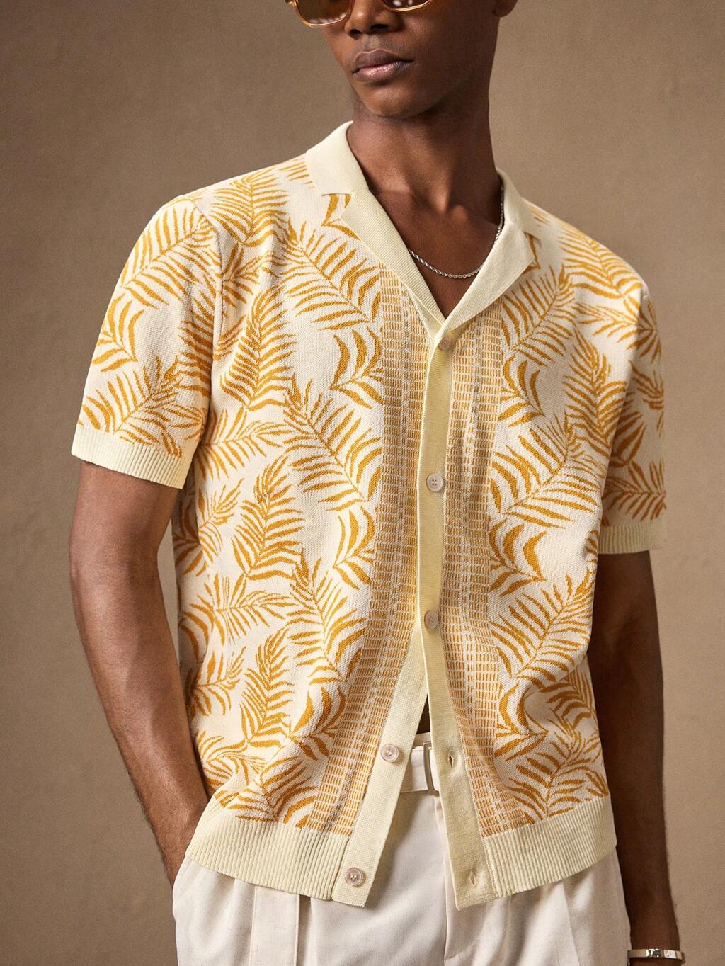 Men's Fitted Jacquard Knit Short Sleeve Casual Shirt, Suitable For Daily Wear, Summer, Holiday, Party, Couple Matching