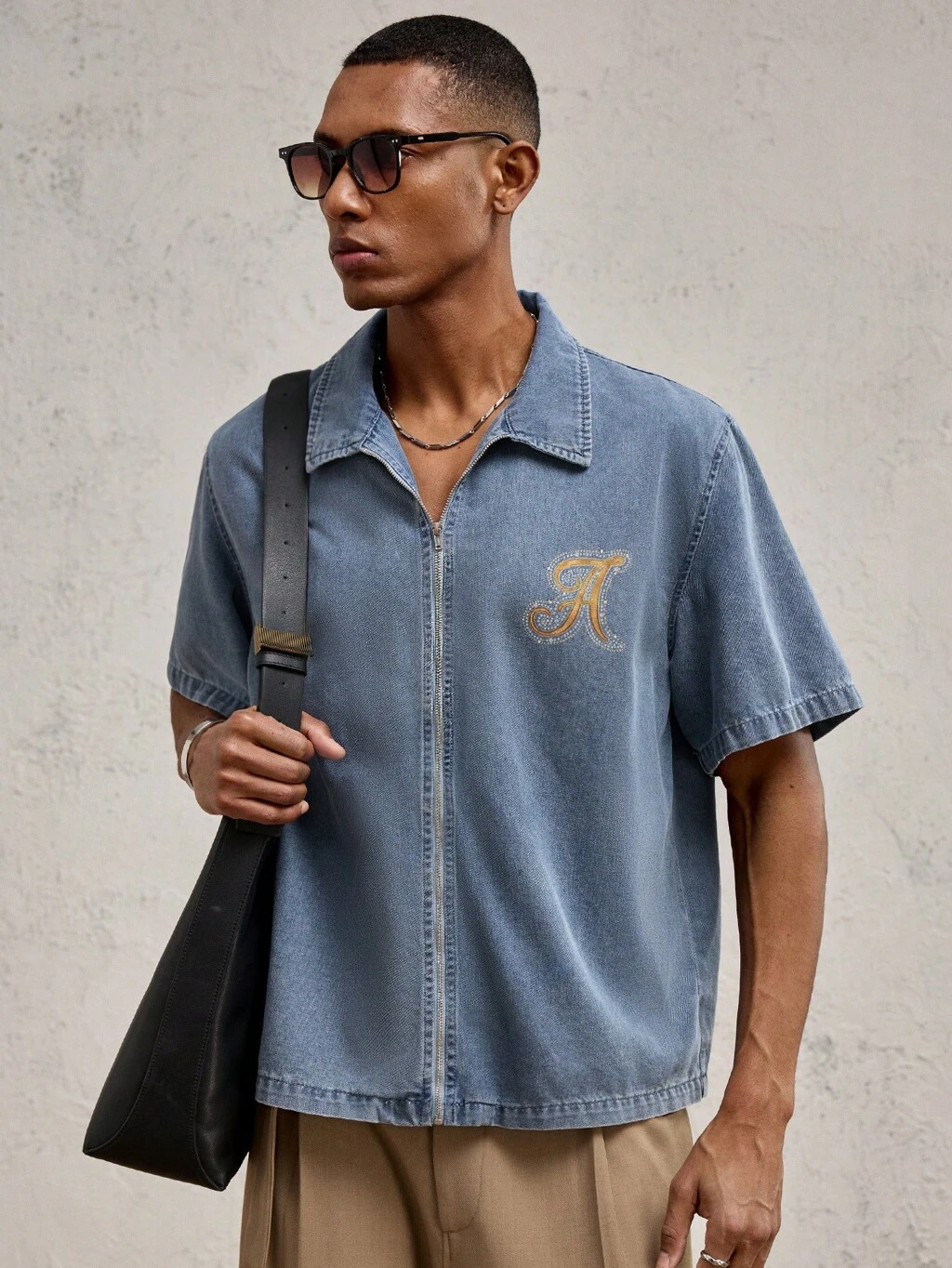 Men's Blue Letter Print Metal Zipper Collar Denim Casual Shirt, Suitable For Everyday Wear And Vacation, Spring/Summer