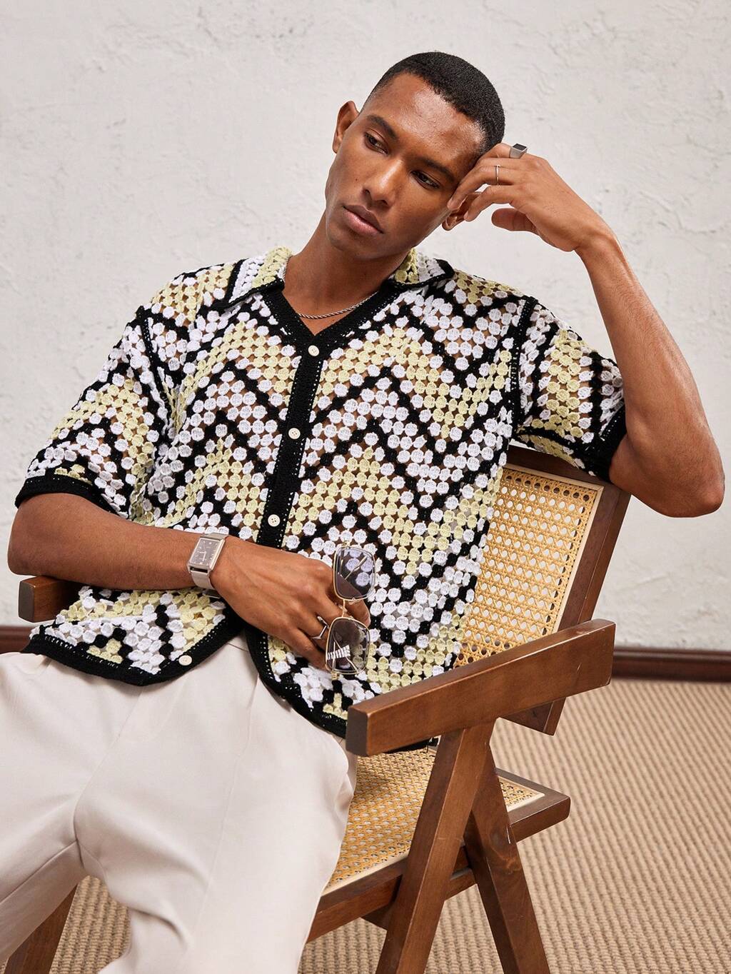 Men's Crochet Checkered Contrast Color Loose Drop Shoulder Hawaiian Collar Casual Knit Shirt, Black & White, Apricot, Suitable For Spring/Summer