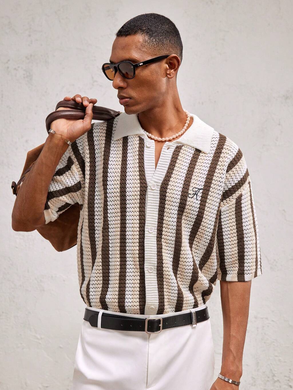 Men's Jacquard Knit Slim Fit Revere Collar Short Sleeve Shirt, Suitable For Daily Wear In Summer