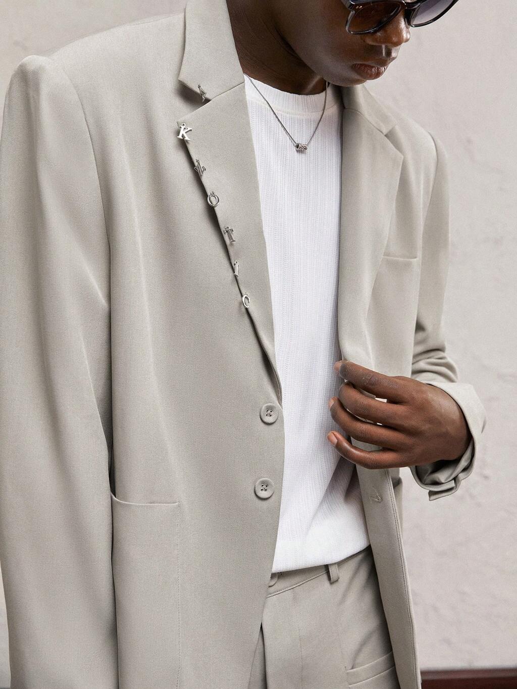 2pcs Men's Light Peach Woven Loose Casual Blazer Suit Set, Suitable For Daily Office, With Letter Metal Decor & Multiple Pockets