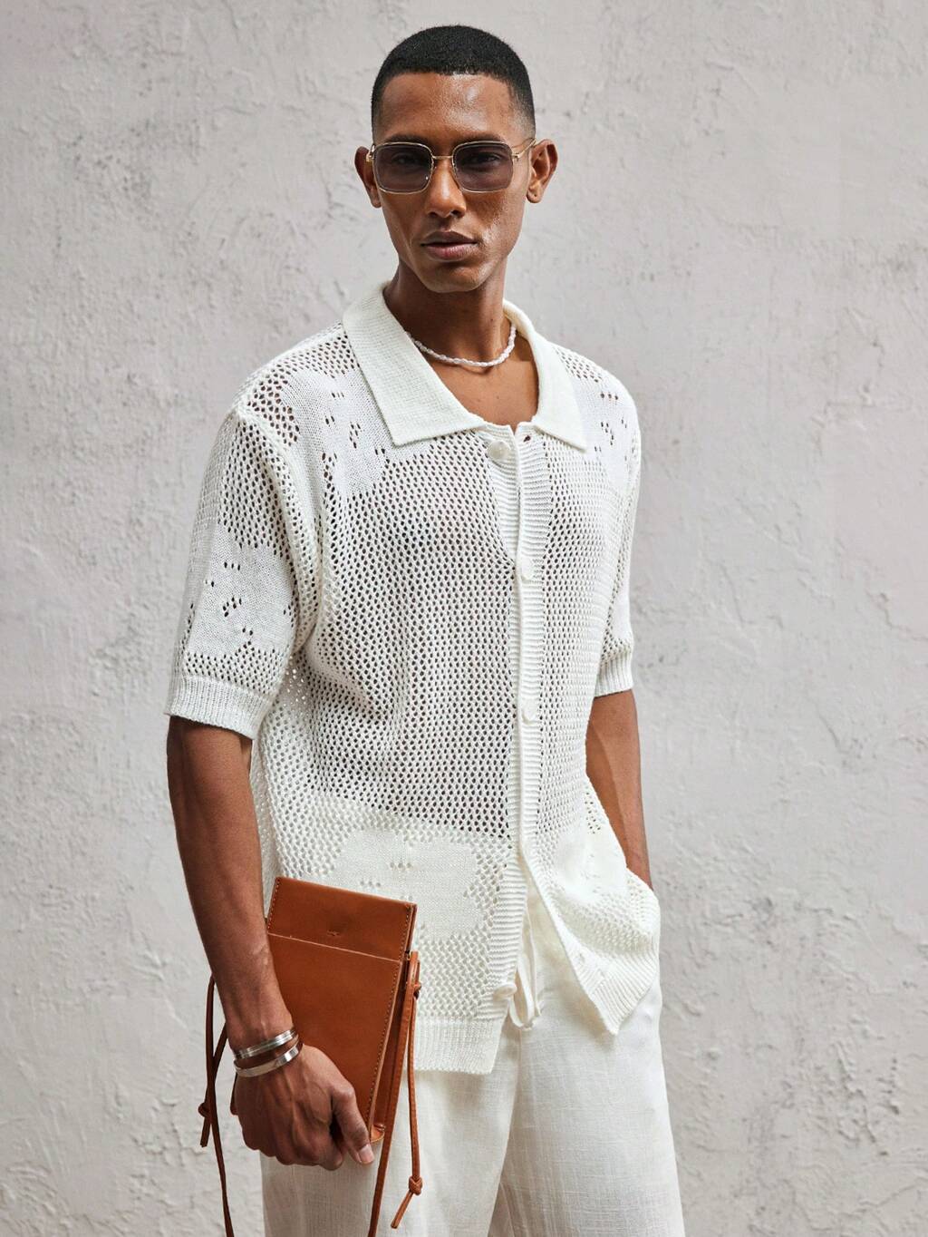 Men's Crochet Checkered Contrast Color Loose Drop Shoulder Hawaiian Collar Casual Knit Shirt, Black & White, Apricot, Suitable For Spring/Summer