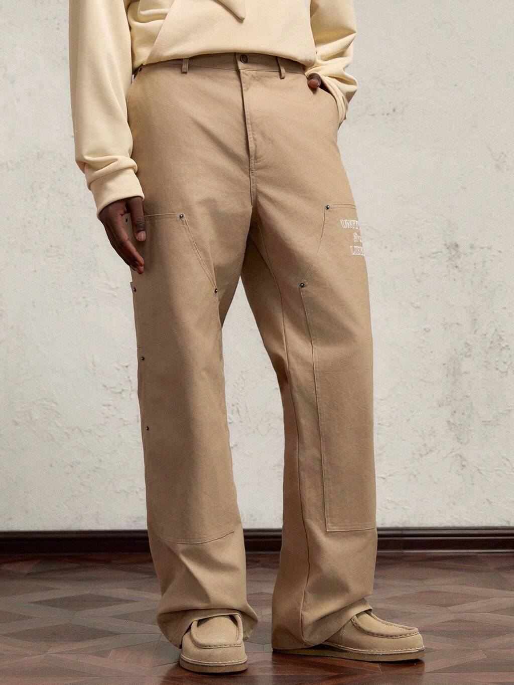 Men's Knit Elastic Waist Mid-Rise Straight Leg Casual Pants - Metal Accent, Khaki With Letter