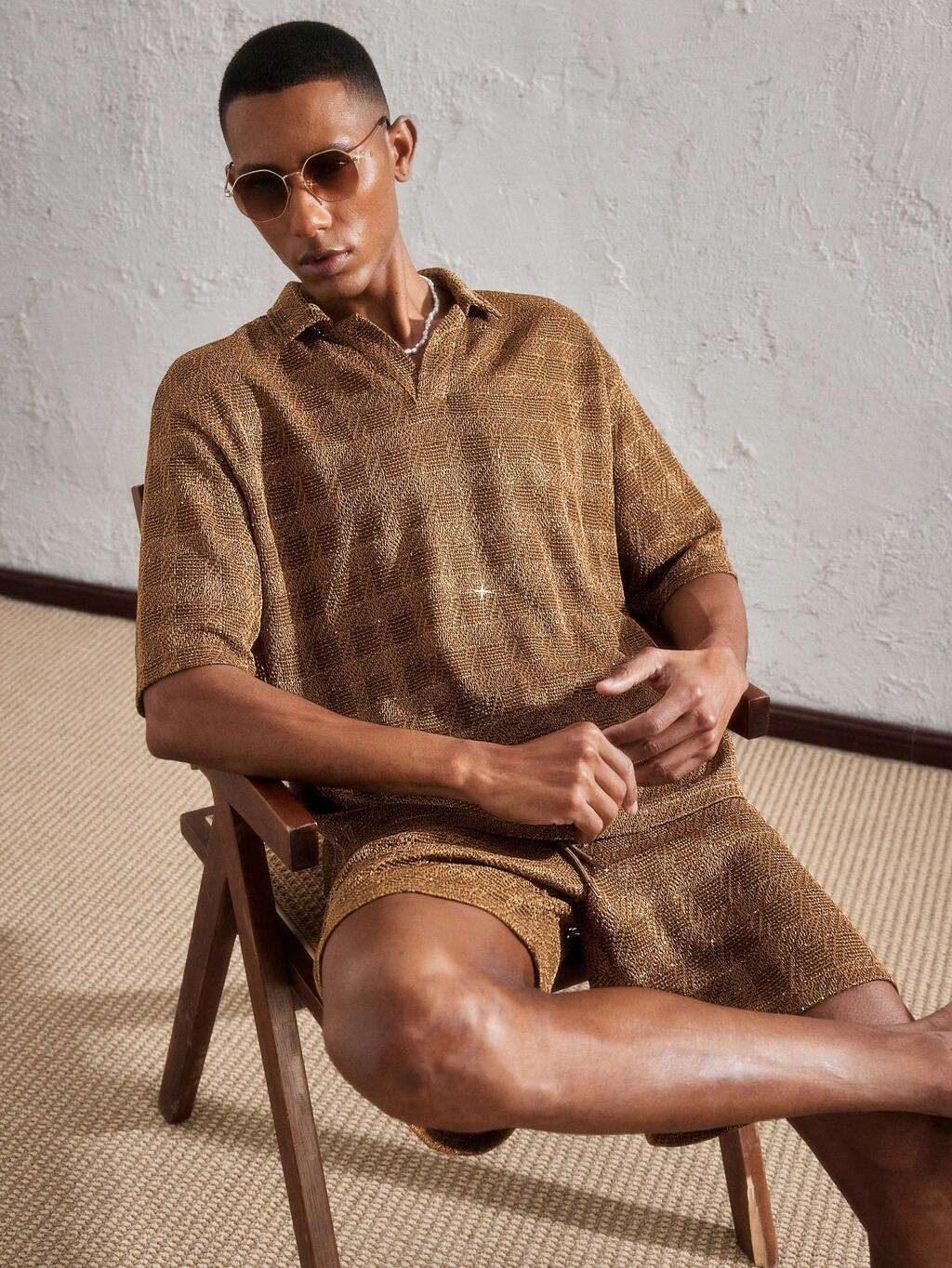 メンズカジュアル ジャカード 半袖シャツ&ストレートレッグショーツセット 2点セット、サマー、バケーション、デイリー、パーティー、カップル、ギフトにも