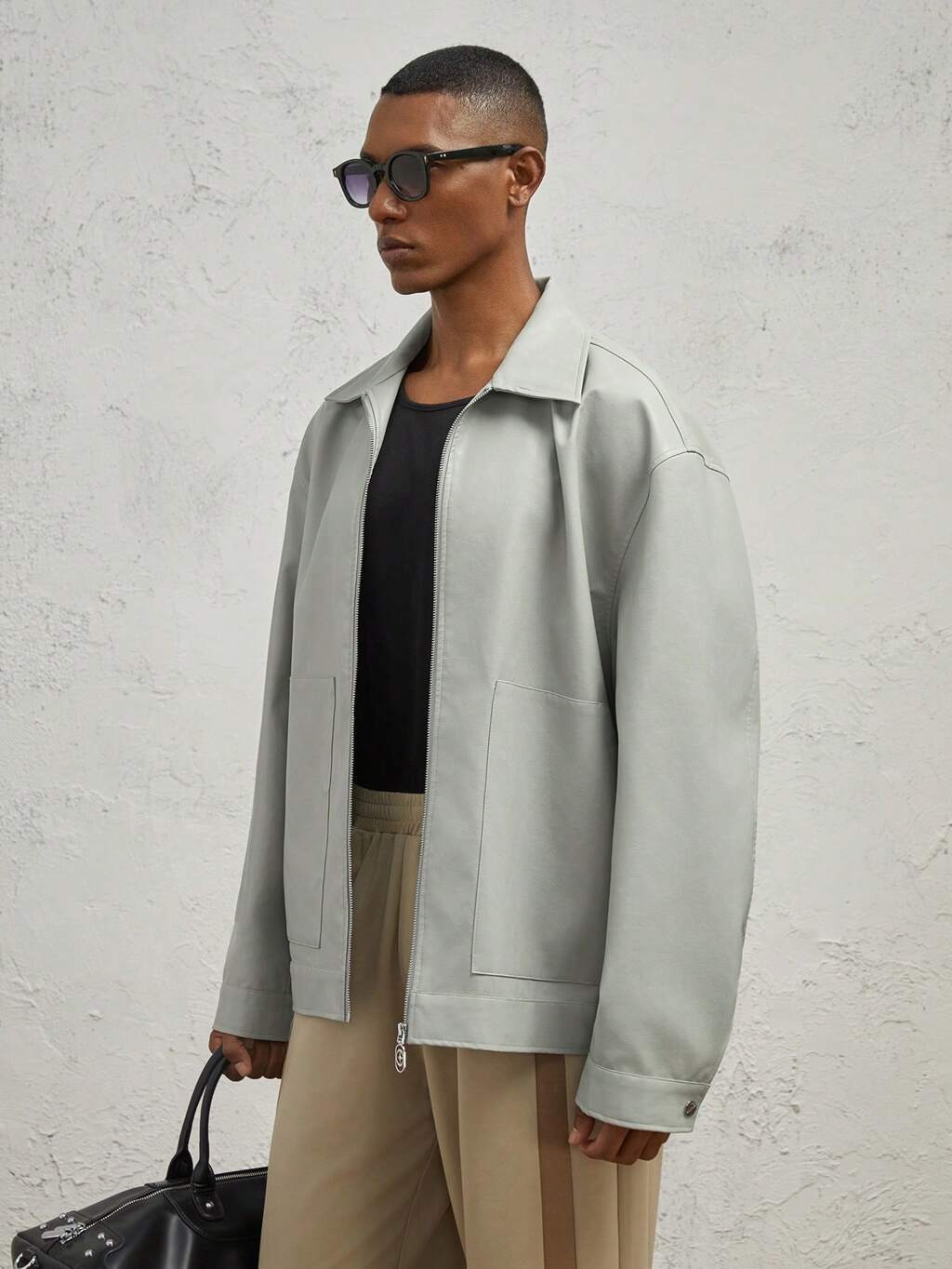 メンズ ルーズフィット ドロップショルダー カジュアル ベースボールカラー ジップアップ 無地ジャケット レザーパッチ付き、秋冬用