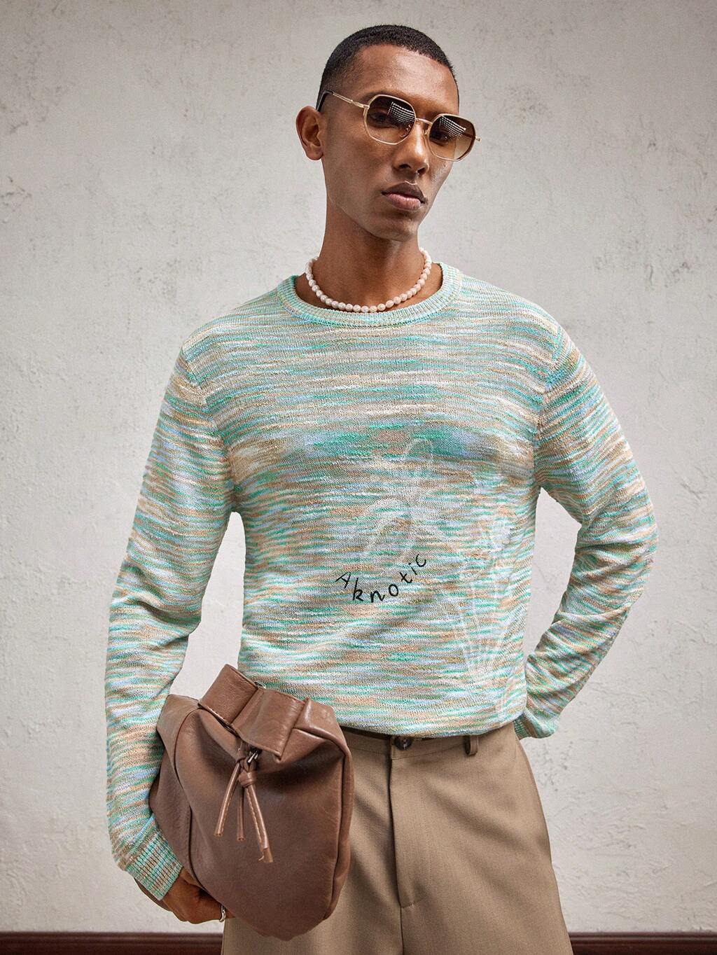 Men's Green Gradient Floral Print Loose Knit Casual Crew Neck Long Sleeve Sweater, Suitable For Spring/Summer, Valentine's Day, And Couples, For Fall Winter